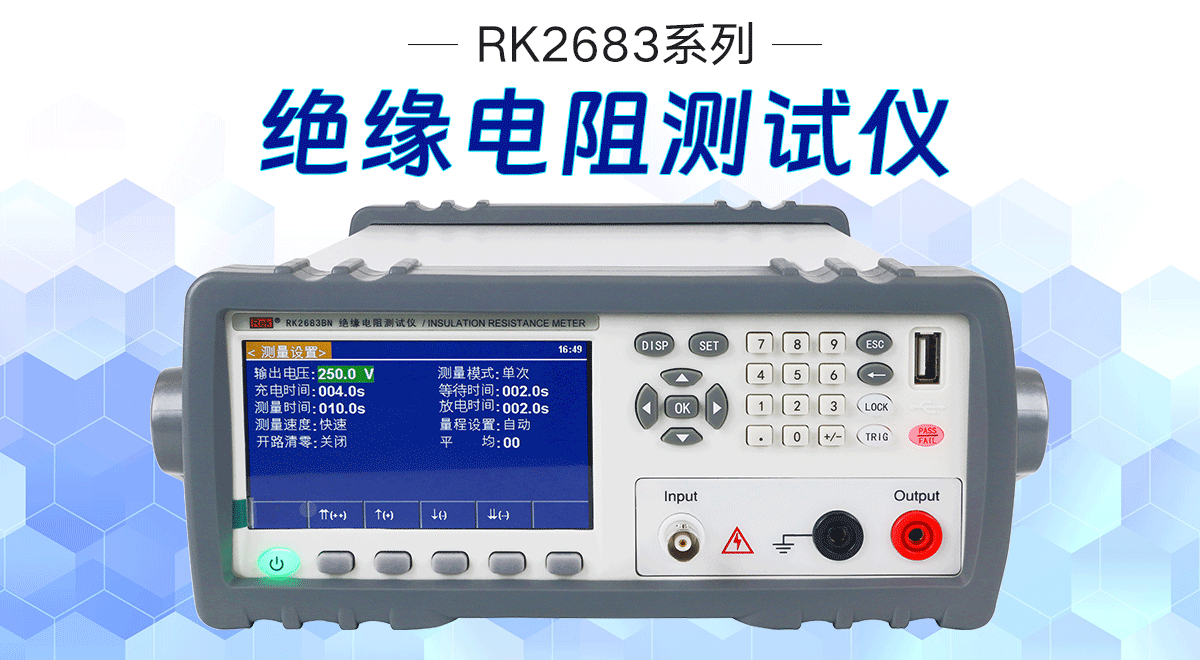 如何测试互感器的绝缘电阻值?可以使用美瑞克RK2683AN绝缘电阻测试仪。输出电压可设定在0-500V,电阻测试范围在10KΩ-5TΩ。测试时把Input接口端和Output接口端分别接好测试线,把Input接口接到被测物的输入线端,被测品输入线为两条,把两条输入线接在一起后夹在Input接口的测试线上。Output测试线夹在互感器的金属上。接线完成启动仪器,点击左下方(电源开关右边)测量设置按键,进入按键设置界面,把电压调到500V,,测量模式调成单次触发,点击DISP按键让仪器到测试界面中,接着点击TRIG按钮进入测试,测试启动后仪器首先进入充电状态,充电完成后开始测试,测试完成后会自动放电,完成本轮测试。